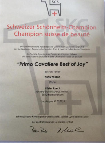 Sanremo Specialty Boston Terrier 06/04/13 Primo Cavaliere Best of Joy 1 MP Best Baby Viterbo International Dog Show Primo Cavaliere Best of Joy 1 VP M.BABY CLASSTorino International Dog Show Specialty Boston Terrier Primo Cavaliere Best of Joy 1VP juniorsNational Dog Show Monza 22/09/2013 Primo Cavaliere Best of Joy (9 months ) 1 ECC YOUNG CLASS BOBLucca Specialty CCC Toy Dog Club Giubileo Championship 29/09/2013Primo Cavaliere Best of Joy 1ECC BOB YOUNGGenua 16.11.2013 Primo Cavaliere Best of Joy Ecc